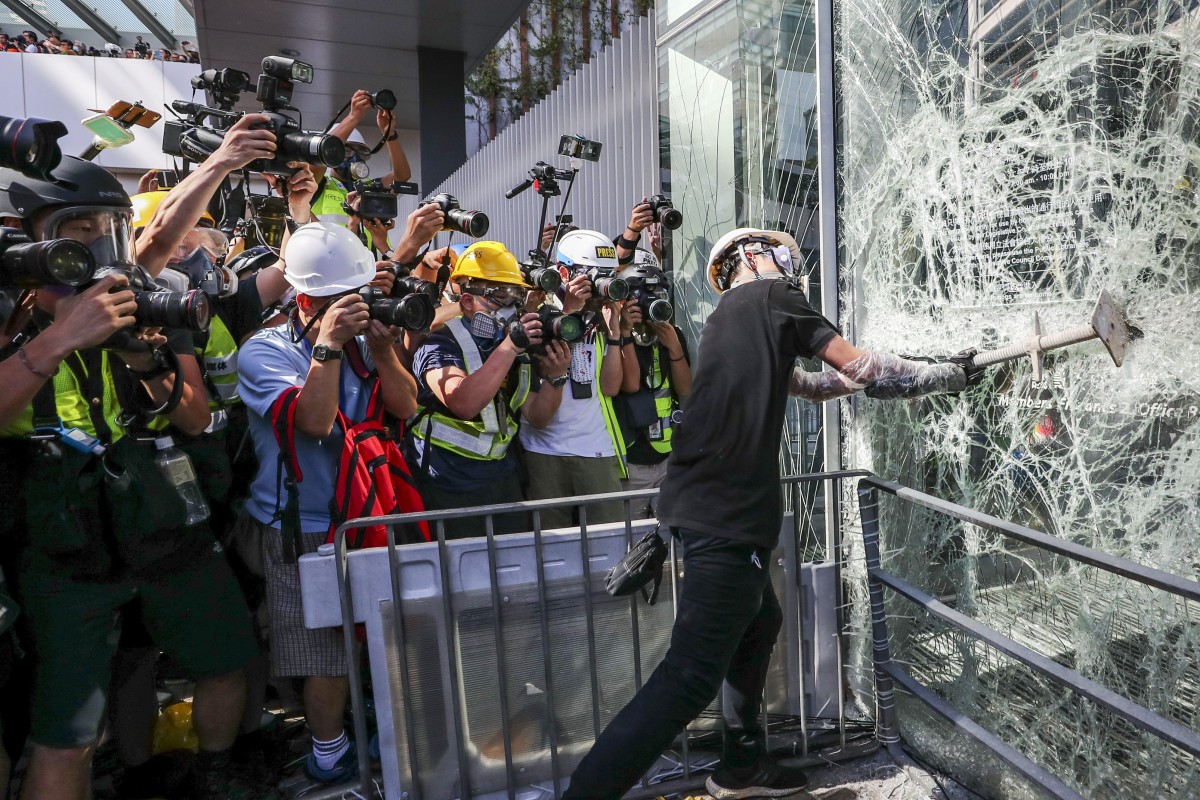 Người biểu tình Hong Kong dùng búa đập vỡ cửa kính của tòa nhà Hội đồng Lập pháp. (Ảnh: SCMP)