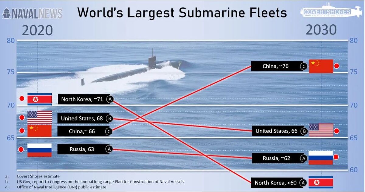 Hiện Mỹ vẫn giữ lợi thế về số lượng và công nghệ tàu ngầm hạt nhân, nhưng phần lớn đội tàu được bổ sung từ thời Chiến tranh Lạnh đang gần tới tuổi nghỉ hưu. Nhà máy đóng tàu Mỹ đang gặp khó khăn trong việc sản xuất đủ tàu Lớp Virginia để duy trì số lượng. Theo kế hoạch dài hạn, số lượng tàu ngầm Mỹ sẽ giảm xuống 47 vào cuối thập niên này, chỉ tăng lên khoảng hơn 50 trong nhiều năm tới và không đạt 66 chiếc trước năm 2054.