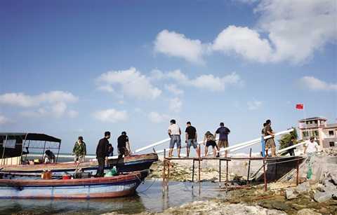 Tân Hoa Xã đăng tải bức ảnh chụp cảnh ngư dân nước này đang vận chuyển vật tư xây dựng từ tàu thuyền lên đảo Cây thuộc cái gọi là thành phố Tam Sa, chuẩn bị xây dựng khu định cư mới cho ngư dân đồn trú trái phép trên đảo này.