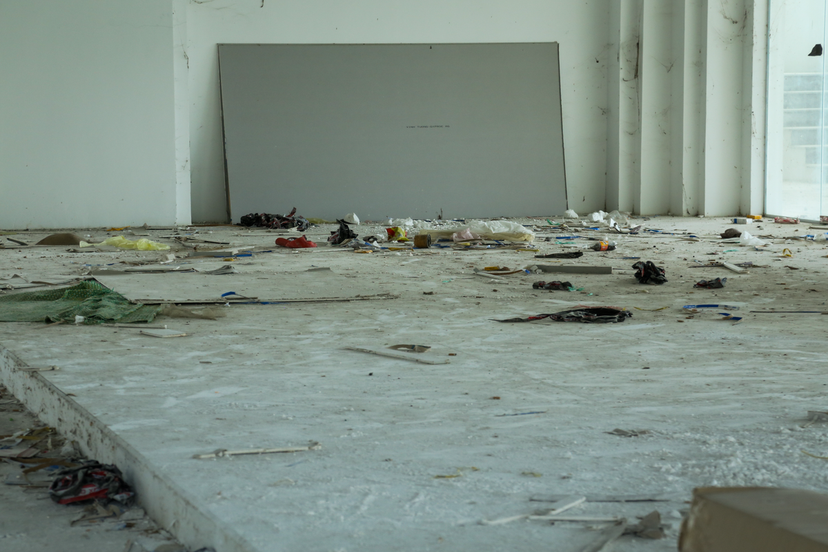 Nền nhà chất đầy rác thải xây dựng.