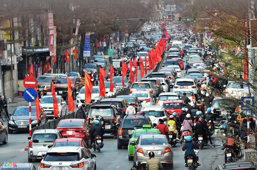 Chiều 16/2 (mùng 1 Tết) người dân đi chùa, chúc Tết, du xuân khiến nhiều ngả đường ở Hà Nội đông nghịt, ùn ứ.
