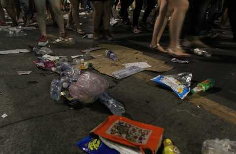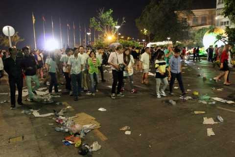 Sau màn bắn pháo hoa 15 phút mừng năm mới Bính Thân, khu vực trung tâm TP HCM trước đó có chục nghìn người tụ tập ngập rác. |