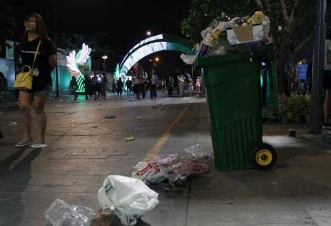 Trên phố đi bộ Nguyễn Huệ, nơi sử dụng làm đường hoa năm nay cũng ngập rác.