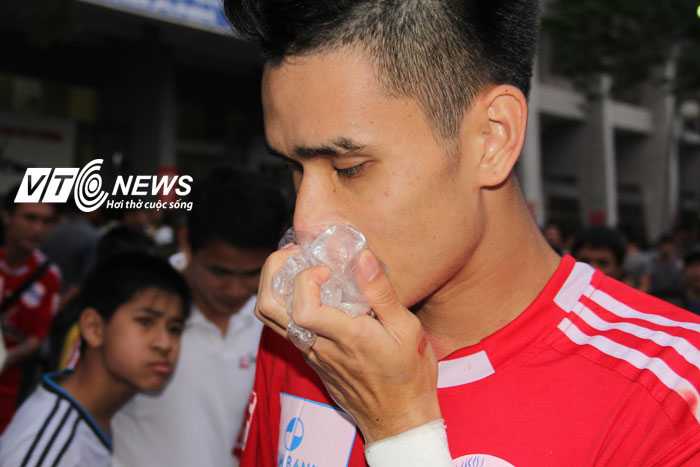 | Tiến Thành ôm mồm đầy máu rời sân (Ảnh: Nhạc Dương) |