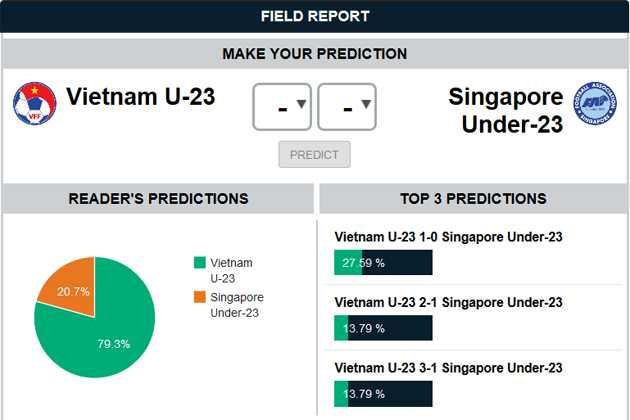 Theo kết quả thăm dò trên trang Goal.com phiên bản Singapore, chỉ có 20,7% người hâm mộ đội bóng Quốc đảo sư tử biển tin đội tuyển của mình sẽ vượt qua U23 Việt Nam trong trận đấu chiều nay (12/12). Tỷ lệ còn lại (79.3%) là phần thắng nghiêng về U23 Việt Nam.