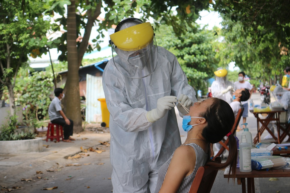 Lực lượng y tế lấy mẫu xét nghiệm người dân khối phố đang bị phong tỏa ở Quảng Nam.