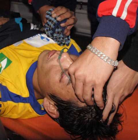 | Huy Hoàng đã bị choáng khá lâu sau pha va chạm với Samson (Ảnh: V.S.I) |