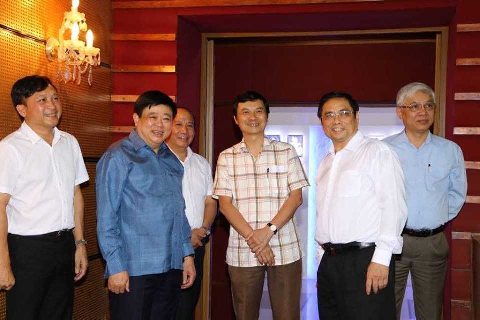Tổng Giám đốc Nguyễn Thế Kỷ (áo xanh) lắng nghe các chỉ đạo từ Trưởng Ban Tổ chức Trung ương Phạm Minh Chính.