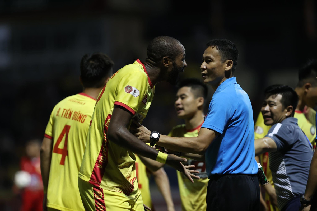 Cầu thủ CLB Thanh Hoá phản ứng với quyết định của các trọng tài.