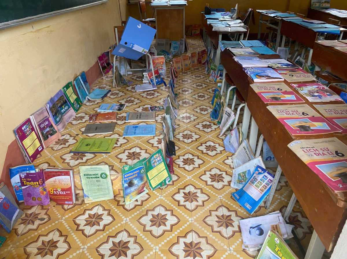 Sau bão, nước lũ tiếp tục dâng cao tràn vào trường, để lại bùn đất và bàn ghế ngổn ngang. Nhiều học sinh chủ động đề xuất thầy cô được cùng dọn dẹp, khôi phục trường lớp.