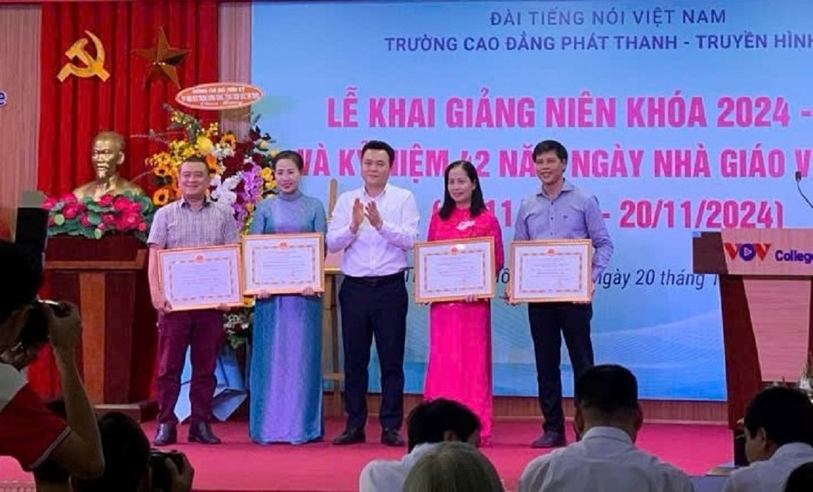 Ông Vũ Hải Quang, Phó Tổng Giám đốc Đài Tiếng nói Việt Nam tặng hoa, chúc mừng thầy trò trường Cao đẳng Phát thanh - Truyền hình II nhân Ngày Nhà giáo Việt Nam. (Ảnh: Hồ Vũ)