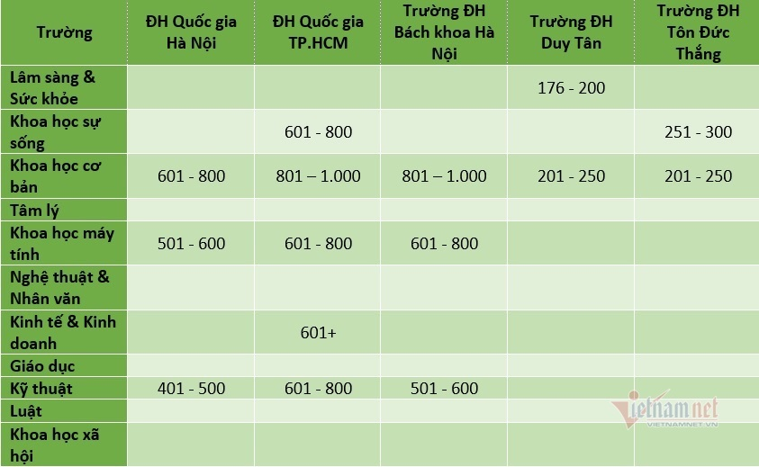 Đại học Quốc gia Hà Nội góp mặt ở 3 lĩnh vực gồm Kỹ thuật (401 – 500, xếp hạng cao nhất Việt Nam), Khoa học máy tính (501 – 600, xếp hạng cao nhất Việt Nam), Khoa học cơ bản (601 – 800).