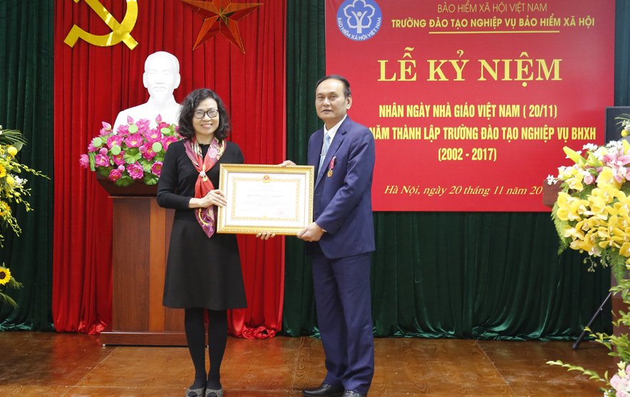 Thứ trưởng, Tổng Giám đốc Nguyễn Thị Minh BHXH Việt Nam chúc mừng thầy cô giáo, công chức, viên chức Nhà trường nhân ngày Nhà giáo Việt Nam và Kỷ niệm 15 năm ngày thành lập trường.