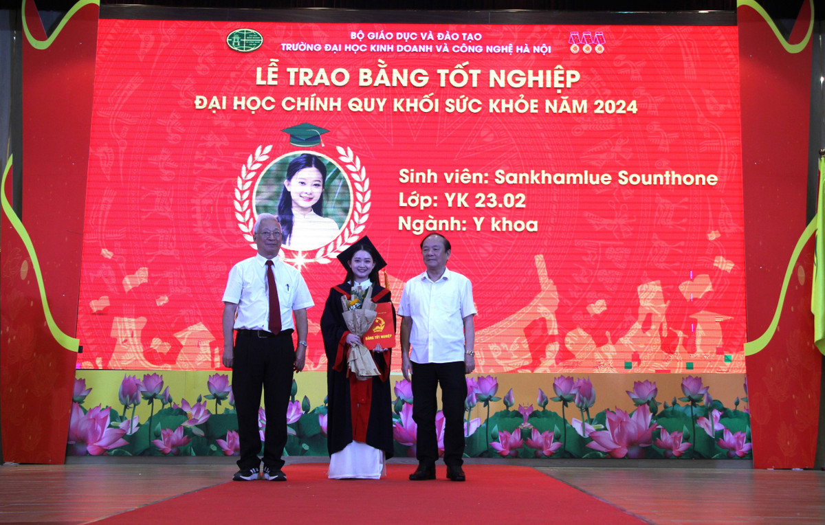 GS. TS Đinh Văn Tiến, Phó Hiệu trưởng nhà trường (bên phải), trao bằng tốt nghiệp cho sinh viên ngành Y có quốc tịch Lào.