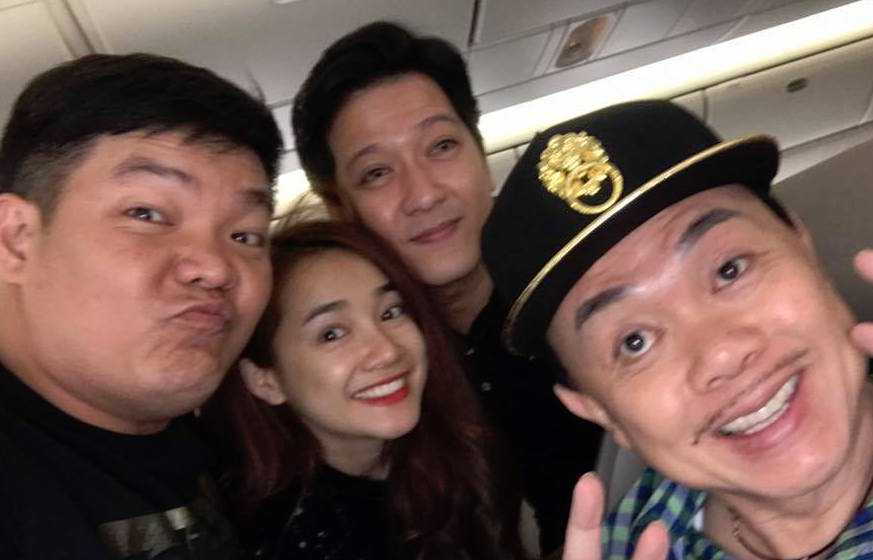 Trường Giang, Nhã Phương cùng danh hài Chí Tài và người quản lý trên chuyến bay sang Mỹ.