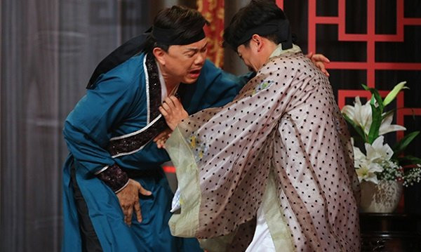 Chí Tài và Trường Giang tranh cãi trên sân khấu.