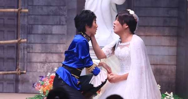 | Trường Giang giả gái, hoá Juliet ép 'Romeo' Kathy Uyên uống thuốc độc. |