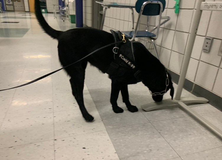 Hai con chó Huntah và Duke, 14 tháng tuổi có khả năng phát hiện ra mùi của virus trên bề mặt, qua đó giúp xác định học sinh, giáo viên, nhân viên mắc COVID-19.