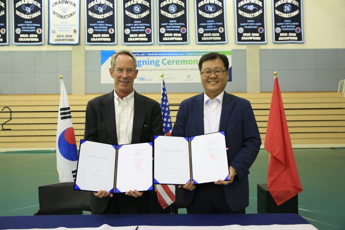 Lễ ký kết ngày 23/6/2020 giữa đại diện Liên doanh Giáo dục quốc tế Ecopark Daesung và đại diện Trường Chadwick (USA) được diễn ra trong khuôn viên trường Chadwick International School ở Songdo, Hàn Quốc