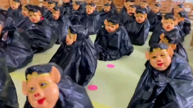 Khi tới nhà trẻ, các phụ huynh ngỡ ngàng khi thấy tất cả học sinh trong lớp mặc bộ đồ rộng, đeo mặt nạ Trư Bát Giới, ngồi lắc đầu và chỉ để hở mắt.