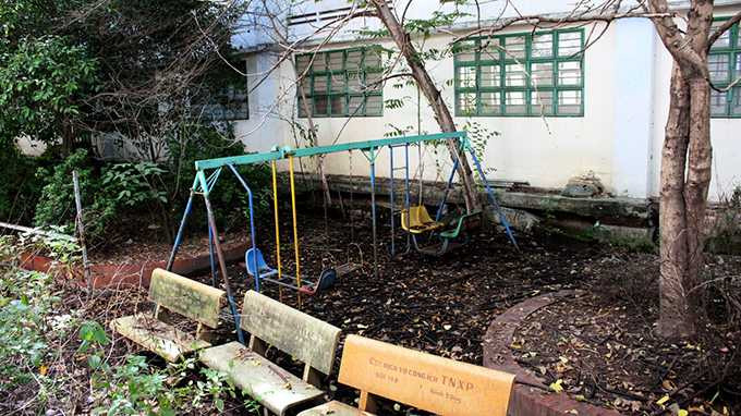 Sự hoang phế thấy rõ nhất khi khuôn viên trường bị cây cối và các loại rác phủ lấp. Toàn bộ mặt sân đều sụt lún 30-60cm. Ghế đá, các dụng cụ ở khu vực vui chơi gãy, xiêu vẹo. Các bậc tam cấp nối sân trường với sàn nhà đều lún sụp hoặc nứt toác tách hẳn với phần nền nhà. Phía sau các dãy phòng học, sân bị lún vài chục centimet, quan sát có thể thấy cả đà, kiềng nền móng sâu bên trong.