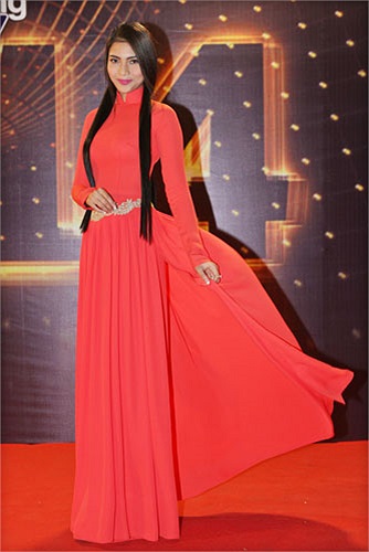 Trong bộ áo dài đỏ thướt tha, mái tóc dài suông, thẳng, Trương Thị May khoe vẻ đẹp quyến rũ và sắc sảo vốn có của mình.
