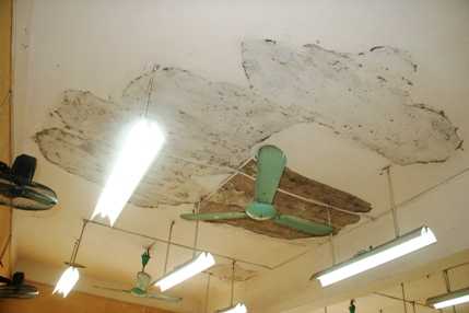 | Mảng tường gần vị trí quạt trần đã rơi xuống đầu nữ sinh L. ngồi ở dưới (Ảnh : Phạm Thịnh) |