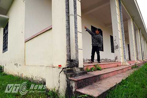 | Ông T, một người dân sống cạnh khu vực trường học đang chỉ cho phóng viên những mảng tường, bậc tam cấp của tòa nhà bị nứt vỡ, mặc dù ngôi trường chưa hề được đưa vào sử dụng |