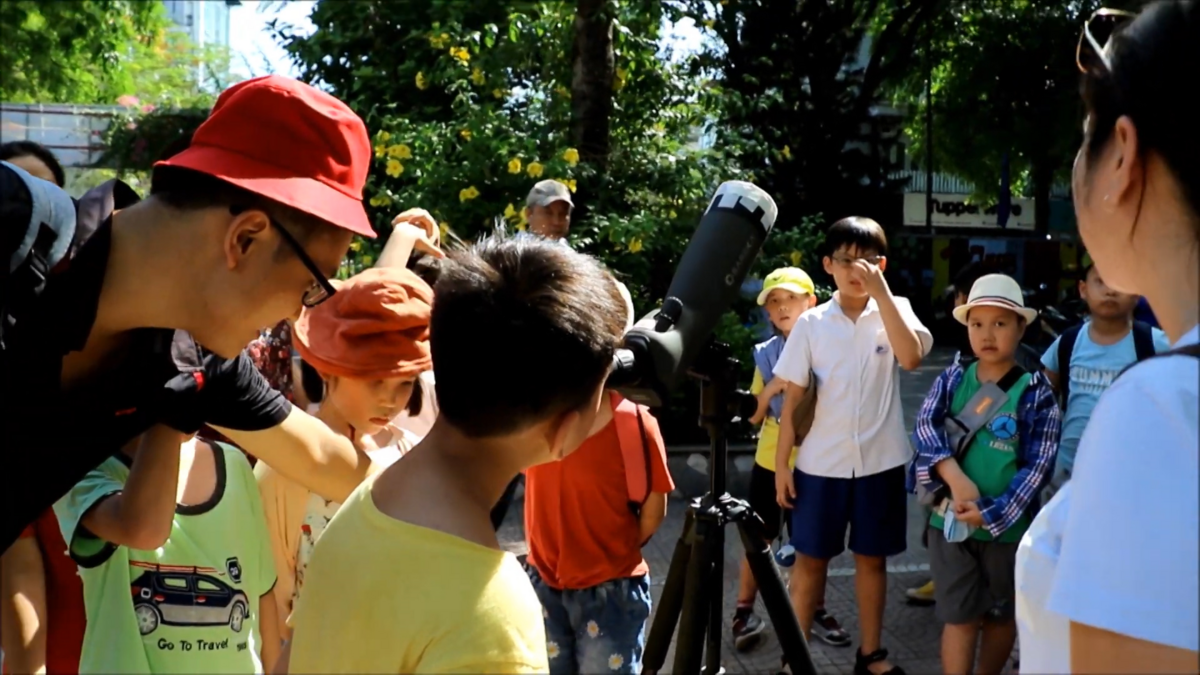 Phụ huynh và học sinh trường Tiểu học Ban Mai (Hà Đông, Hà Nội), thích thú khi được ngắm hiện tượng nhật thực không toàn phần bằng kính thiên văn và các đồ tự chế.