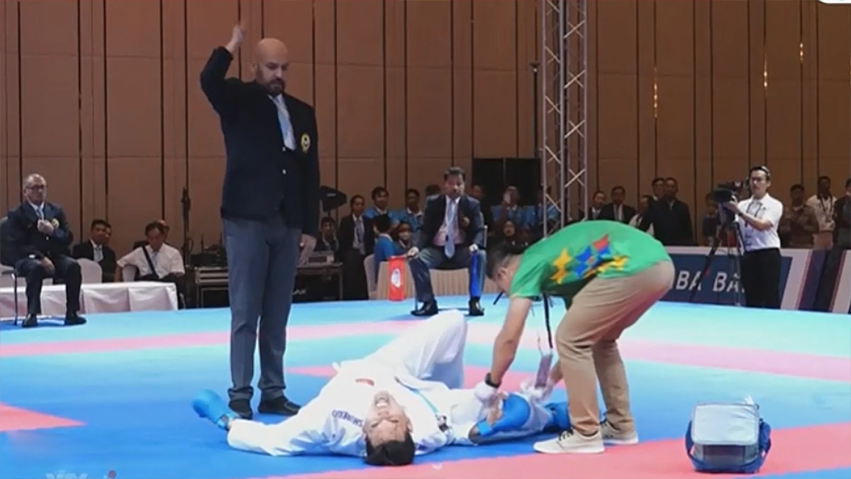 Trong tình huống lùi tránh cú đấm của đối thủ, Trần Lê Tấn Đạt bị trượt chân, dẫn đến chấn thương đầu gối. Võ sĩ này nằm gục xuống sàn tỏ rõ vẻ đau đớn. Đội ngũ y tế của đội tuyển Việt Nam lập tức chườm đá sơ cứu. Những dấu hiệu cho thấy đây có thể là chấn thương dây chằng rất nặng.