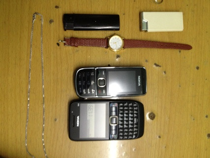 Tang vật thu giữ được tại hiện trường gồm: hai điện thoại di động Nokia, một đồng hồ đeo tay, hai bật lửa, một sơi dây chuyền bằng vàng trắng dài khoảng 55cm.