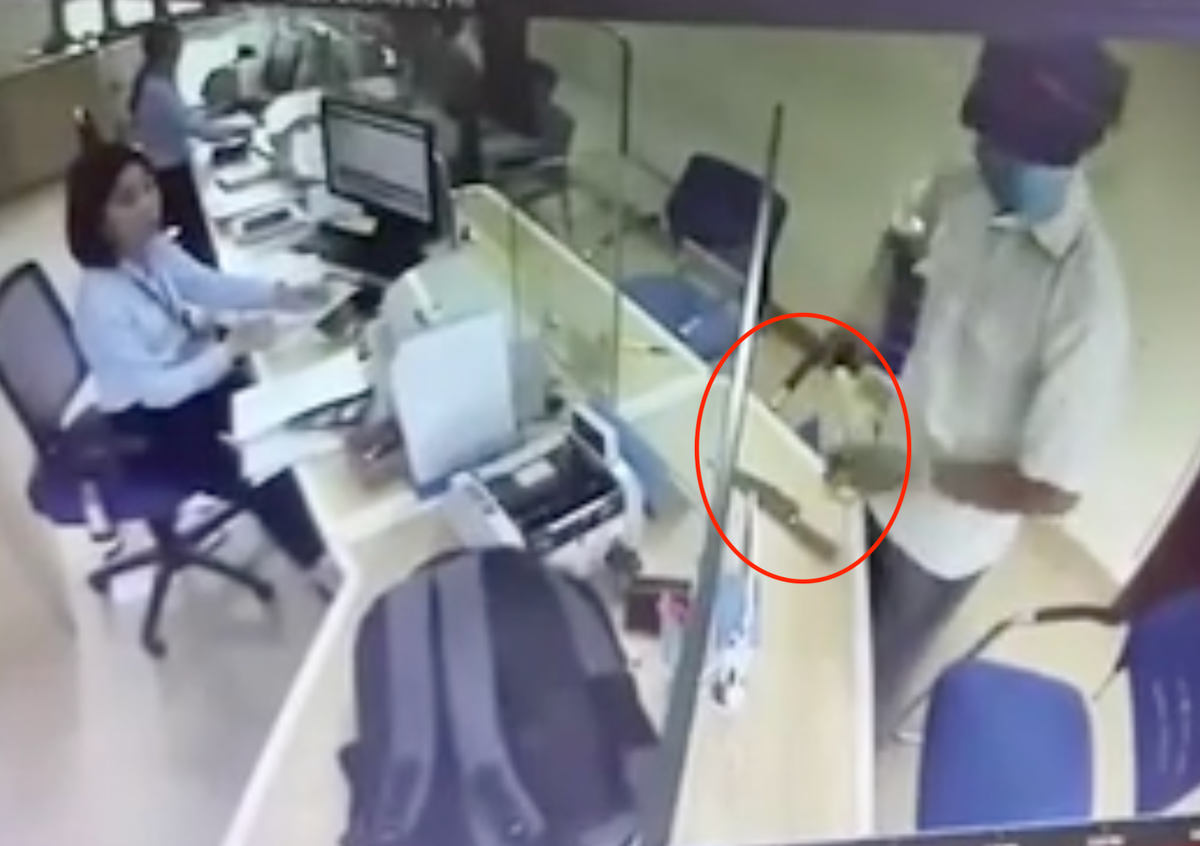 Hình ảnh người đàn ông cầm dao bầu đe dọa nhân viên ngân hàng.