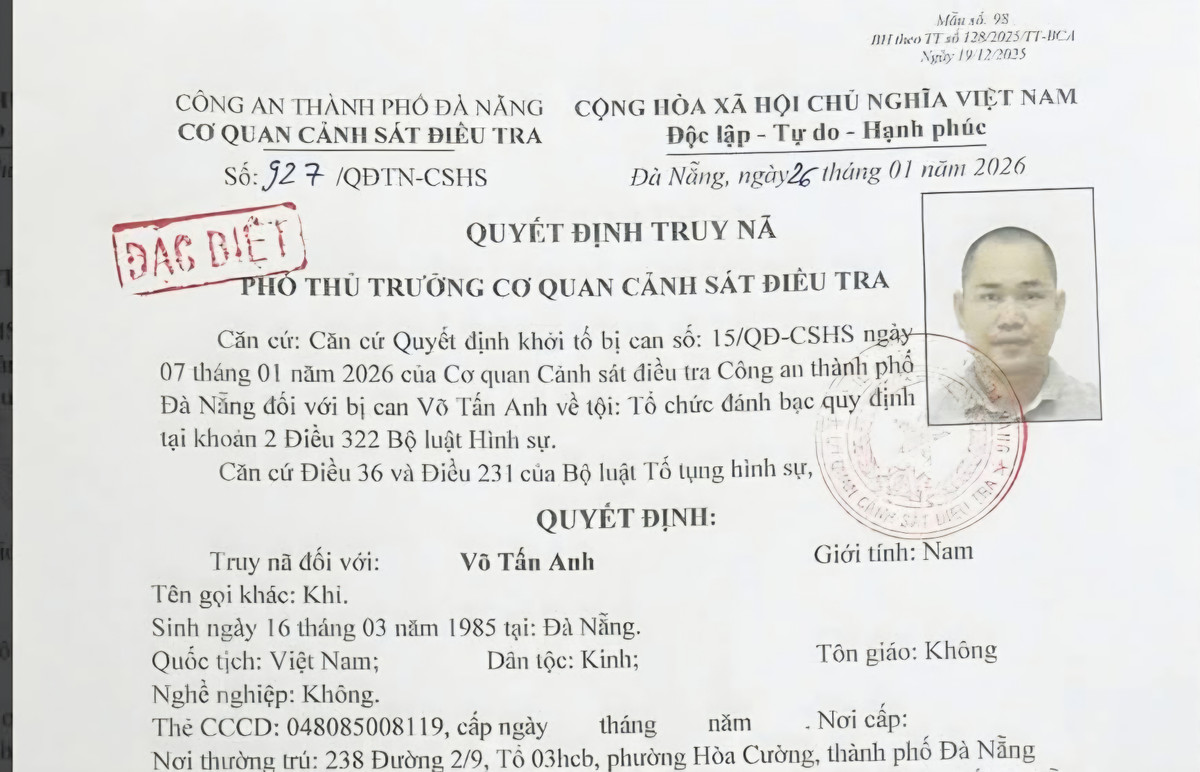 Trên cơ sở thông tin, tài liệu thu thập được, Cơ quan Cảnh sát điều tra Công an TP Đà Nẵng xác định Võ Tấn Anh là đối tượng cầm đầu đường dây cá độ bóng đá đã bỏ trốn nên quyết định truy nã loại “Đặc biệt”.