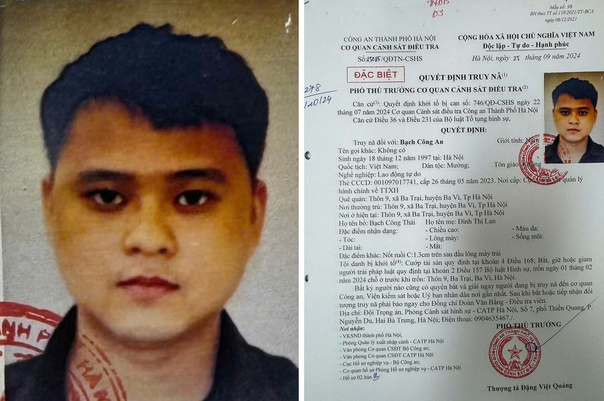 Ngày 6/11, Cơ quan cảnh sát điều tra Công an TP Hà Nội ra quyết định truy nã đặc biệt đối với Bạch Công An (SN 1997, trú xã Ba Trại, huyện Ba Vì, Hà Nội) về tội Cướp tài sản và Bắt giữ hoặc giam người trái pháp luật.