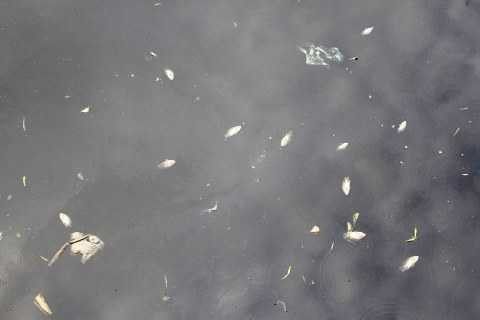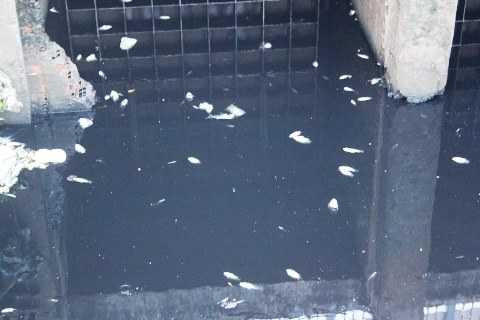 | Cá chết với mật độ dày đặc, nổi bồng bềnh trên mặt nước đen ngòm |