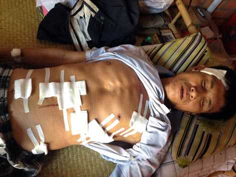 | Anh Lê Mộng Quyền nằm trên giường bệnh với hàng loạt vết thương trên người. |