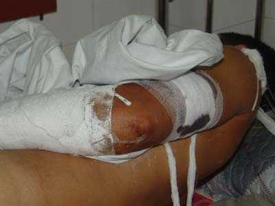 Nạn nhân đang nằm viện điều trị với 7 vết chém trên khắp cơ thể, khiến tay trái hỏng hoàn toàn, tay phải hỏng tới 70%, chân vai gáy có nhiều vết thương dài hàng gang tay.