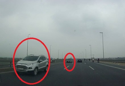 Hai chiếc ô tô trong tổng số 5 chiếc chạy ngược chiều trên cầu Nhật Tân bị camera hành trình ghi lại. (Ảnh chụp màn hình)