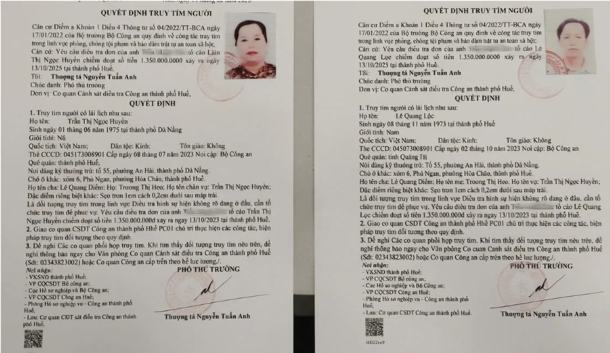 Cả hai bị truy tìm để phục vụ công tác điều tra theo đơn tố cáo của ông T.M.Đ (SN 1987, trú tỉnh Quảng Trị, hiện ở phường Vỹ Dạ, TP. Huế), liên quan đến hành vi chiếm đoạt số tiền 1,35 tỷ đồng xảy ra ngày 13/10/2025 tại TP Huế.