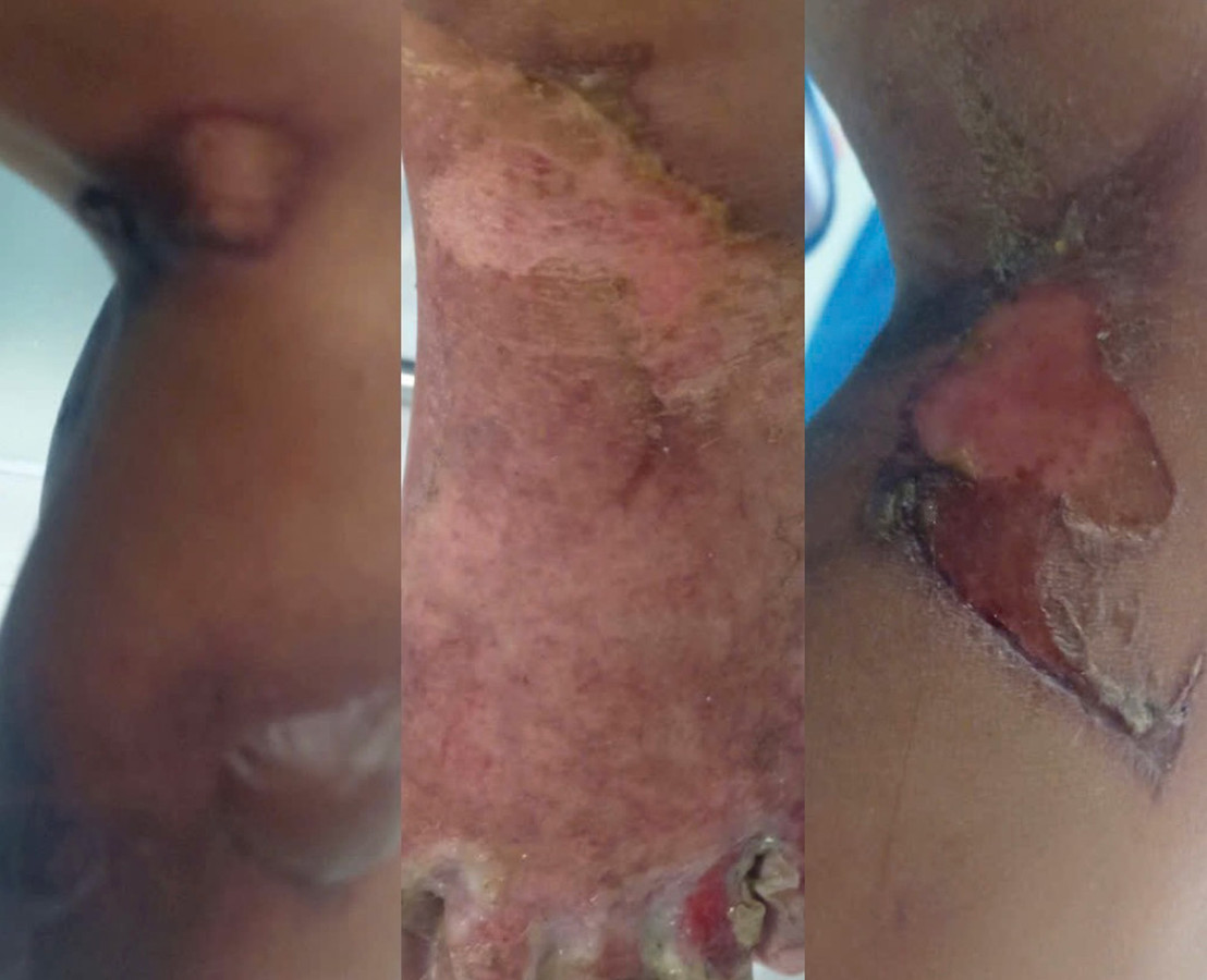 Tại bệnh viện, bé K. tỉnh, chi ấm, mạch rõ, sốt cao liên tục, ho nhiều, vết bỏng tụt da, da chết trắng, thâm hôi, phù nề nhẹ, diện tích phỏng chân trái 7% chân, phải 5%, tổn thương phổi, men gan tăng cao.