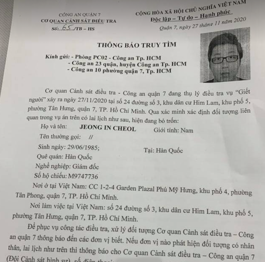 Theo đó, danh tính Giám đốc người Hàn Quốc được xác định là ông Jeong In Cheol (35 tuổi, quốc tịch Hàn Quốc, lưu trú ở Quận 7) có liên quan trong vụ án, hiện đang bỏ trốn. Ông Cheol đang là Giám đốc một công ty, thuê làm việc tại căn nhà xảy ra vụ án thuộc khu dân cư Him Lam.