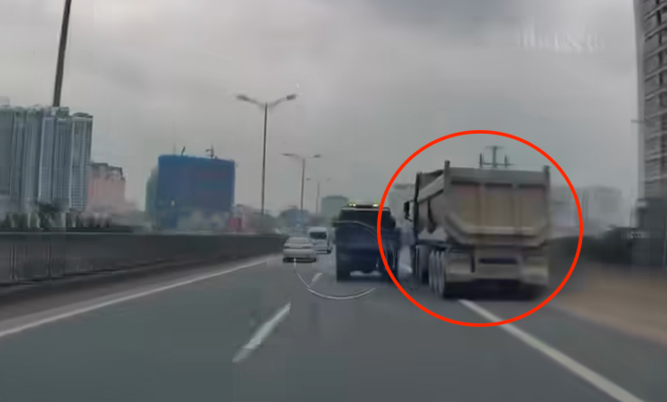 Xe ben đi vào làn đường khẩn cấp, vượt ô tô khác trên Vành đai 3 trên cao.