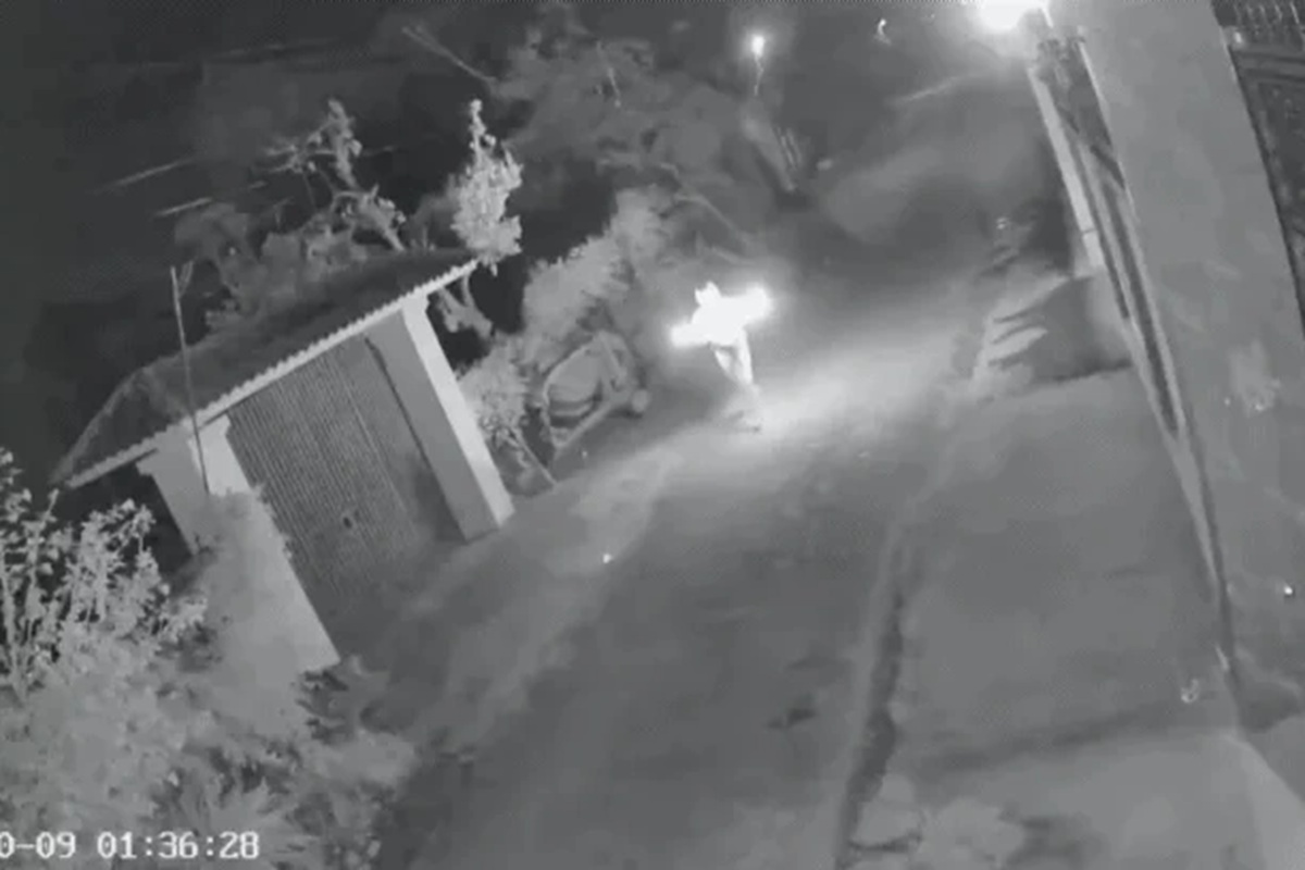 Theo hình ảnh trích xuất từ camera an ninh, khoảng 1h36 ngày 9/10, một người đàn ông cầm theo hai chai chứa chất lỏng đang cháy lao tới trước cổng một hộ dân. Đối tượng ném liên tiếp hai chai xuống khu vực cổng rồi phóng xe rời khỏi hiện trường.