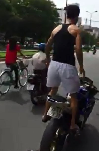 Theo đó, nam thanh niên đầu trần bất ngờ thả hai tay, lùi người về phía sau xe và đứng dậy mặc cho chiếc xe vẫn lưu thông. Nguy hiểm hơn, khi phát hiện phía trước có một người đi xe đạp, thanh niên này không cầm tay lái để điều khiển mà cố gắng nhoài người để chiếc xe né người đi xe đạp nói trên.