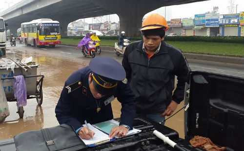 | Thanh tra Giao thông lập biên bản xử phạt tài xế làm vương đất đá ra đường. |