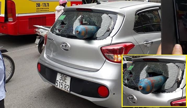 Đến đoạn ngã tư Nguyễn Trãi – Khuất Duy Tiến, ô tô bị một chiếc bình khí rơi trúng, xuyên thủng phần kính phía sau xe.