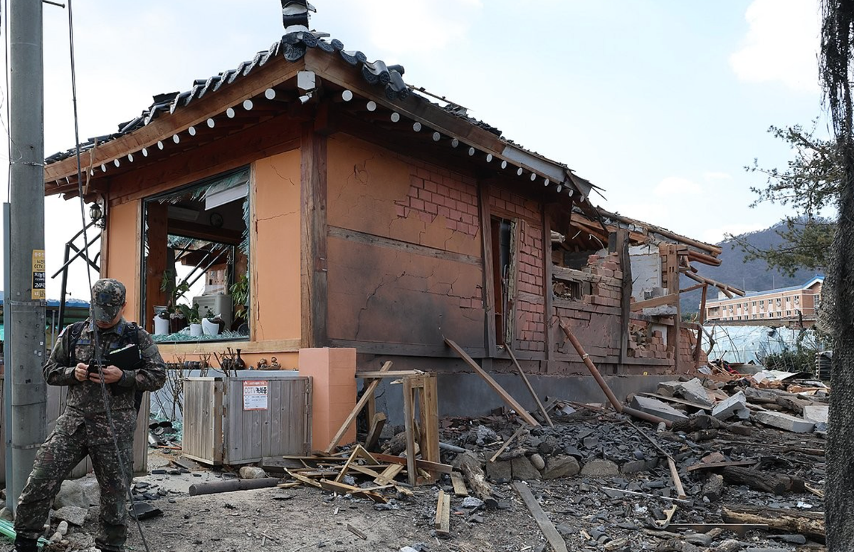 Hiện trường vụ ném bom nhầm vào nhà dân hồi tháng 3/2025. (Ảnh: Yonhap)
