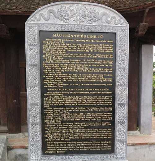 Cụ thể, tại đền thờ các vị vua triều Trần đã dựng bia có kích thước cao 2,75m, rộng 1,7m, chân bia cao 0,5m làm theo hình thức “rồng ổ”. Chất liệu bằng đá xanh; lòng bia (mặt trước) khắc nội dung văn bia “Trần triều đế miếu” bằng tiếng Việt và tiếng Anh.