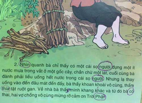 Một hôm trời nắng gắt, người vợ vào rừng lấy củi, khát nước quá mà không tìm đâu ra nước, nên đành liều uống nước trong cái sọ người ở một gốc cây". Truyện còn dùng ngôn từ khá "mạnh" với trẻ nhỏ như: "quái thai", "đem chôn sống nó đi...".