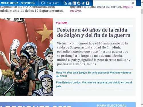 Ngày 30/4, các tờ báo lớn của Argentina đồng loạt đăng lên trang nhất các bài viết liên quan tới Việt Nam nhân kỷ niệm 40 năm Ngày Giải phóng miền Nam, thống nhất đất nước (30-4-1975/30-4-2015).